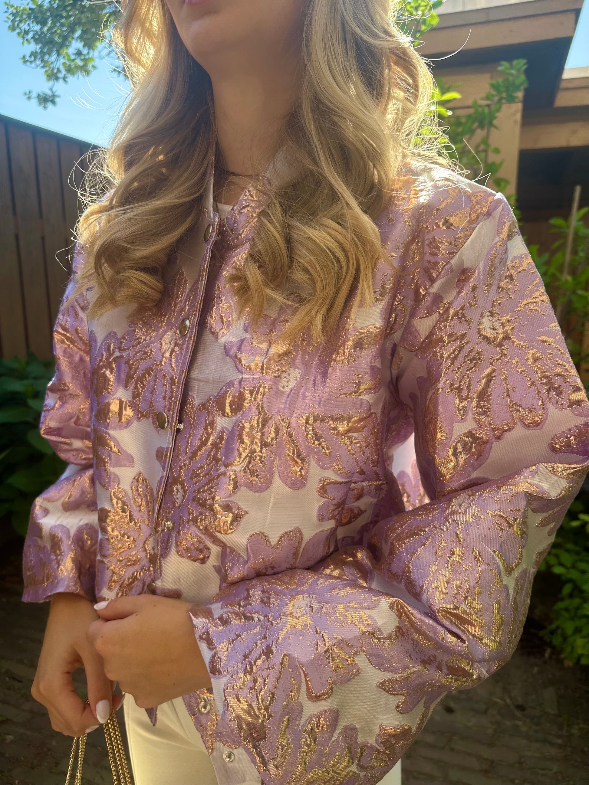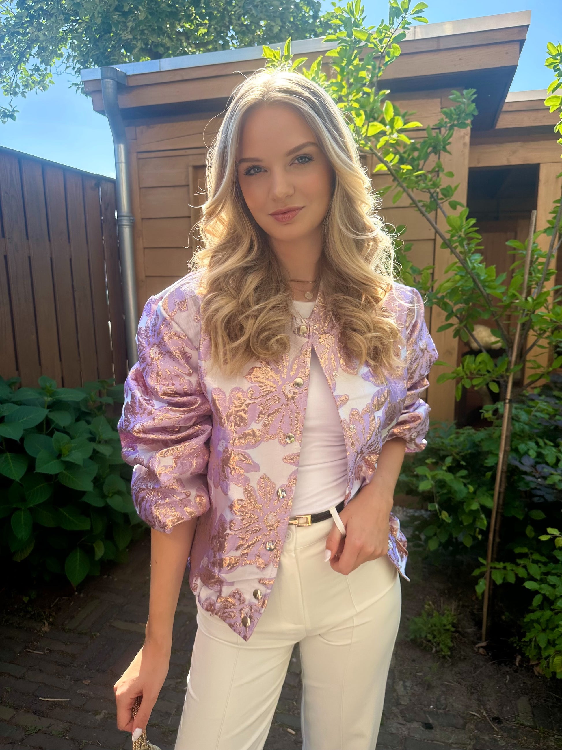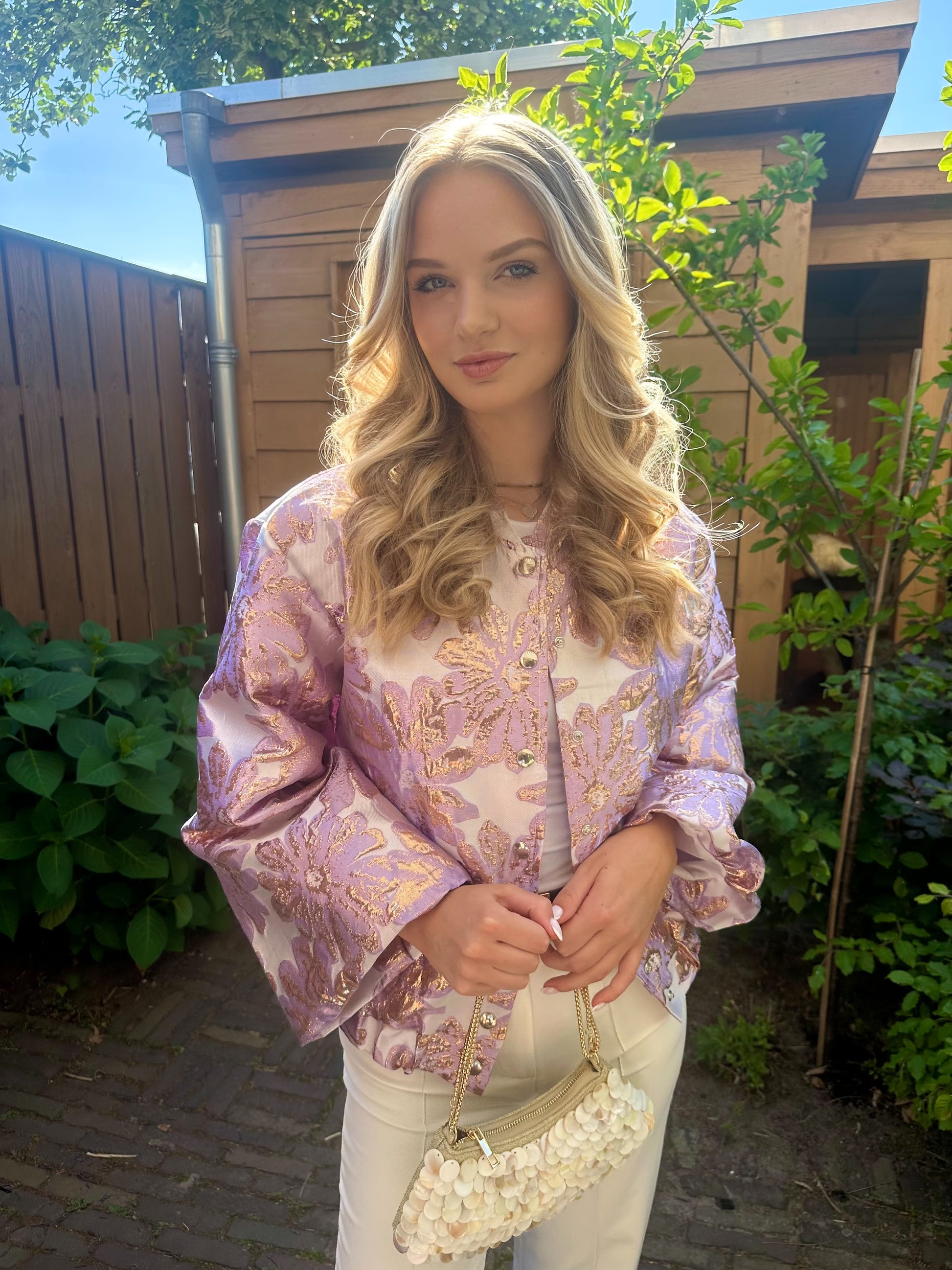 Paarse jacquard jas. One size fits all. Gecombineerd met onze Mara top wit en de Ibiza tas.