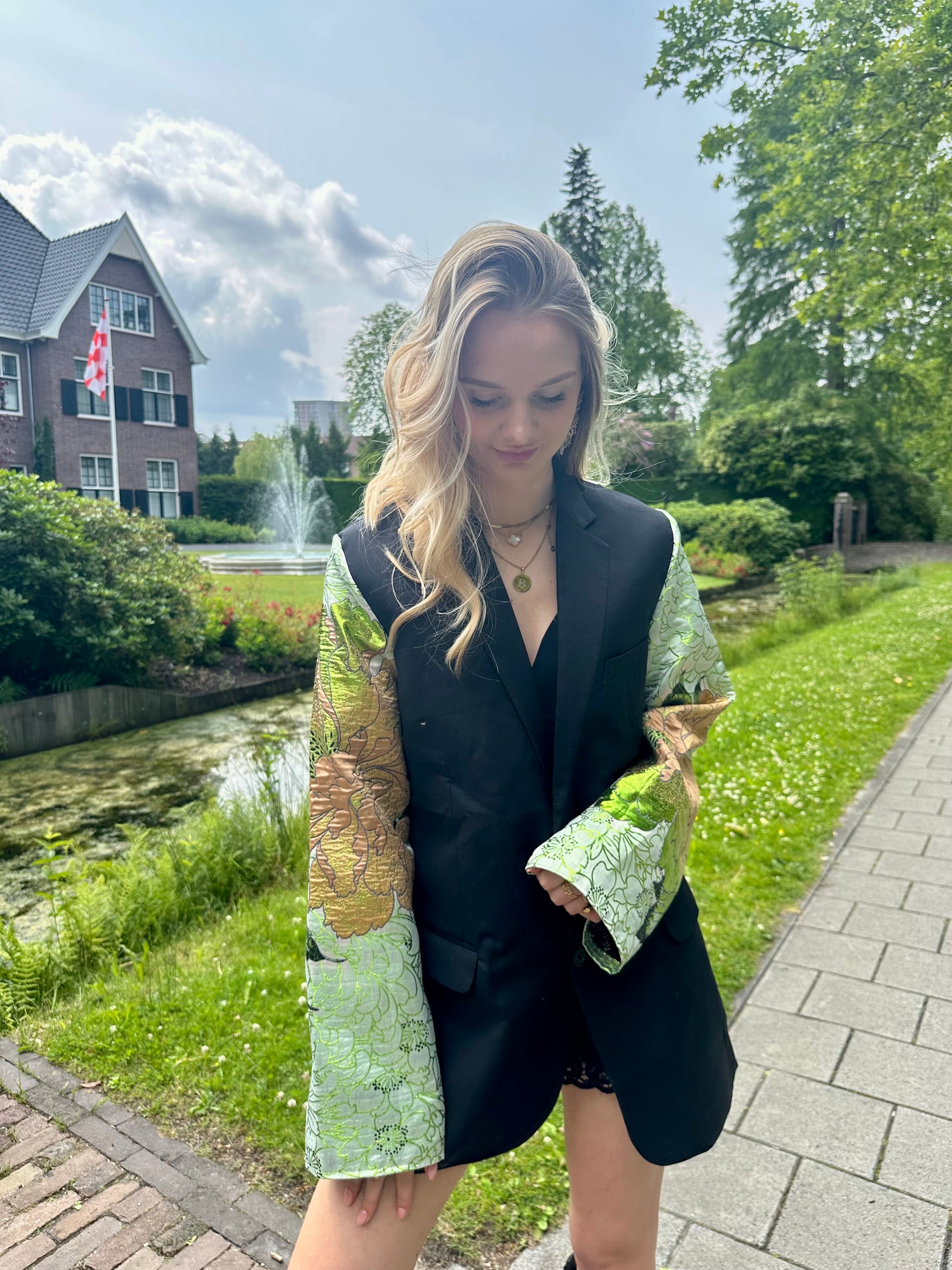 One size blazer met een oversized fit, passend van maat S t/m XL. De mouwen worden door mij met de hand gemaakt van een prachtige stof en in de blazer gezet. Hierdoor kan het patroon of de plaatsing iets afwijken van de foto, elk blazer is uniek.
