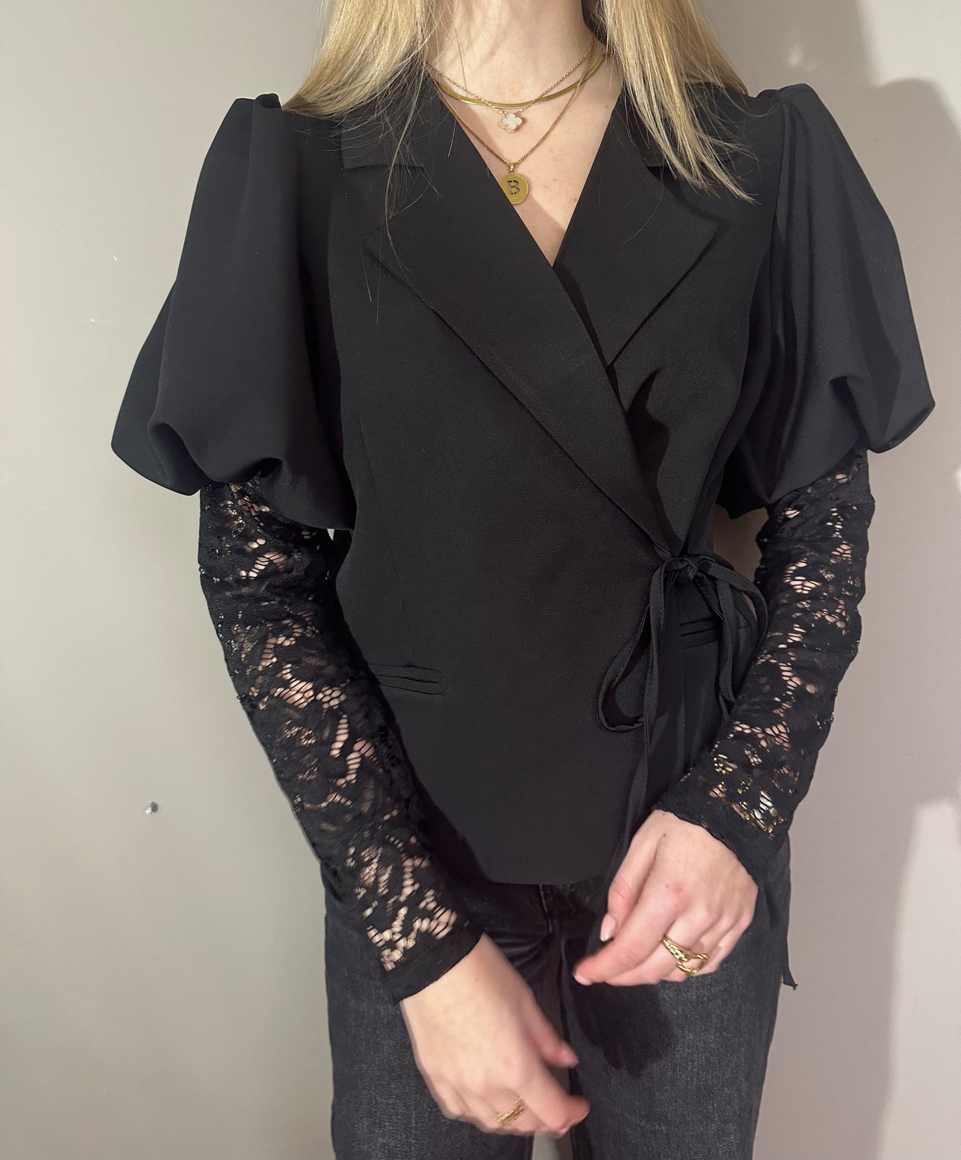 Mooie korte blazer met kanten mouwen. De kanten mouwen zitten vast aan de blazer. Ook verkrijgbaar in het wit. One size van maat 36-42.