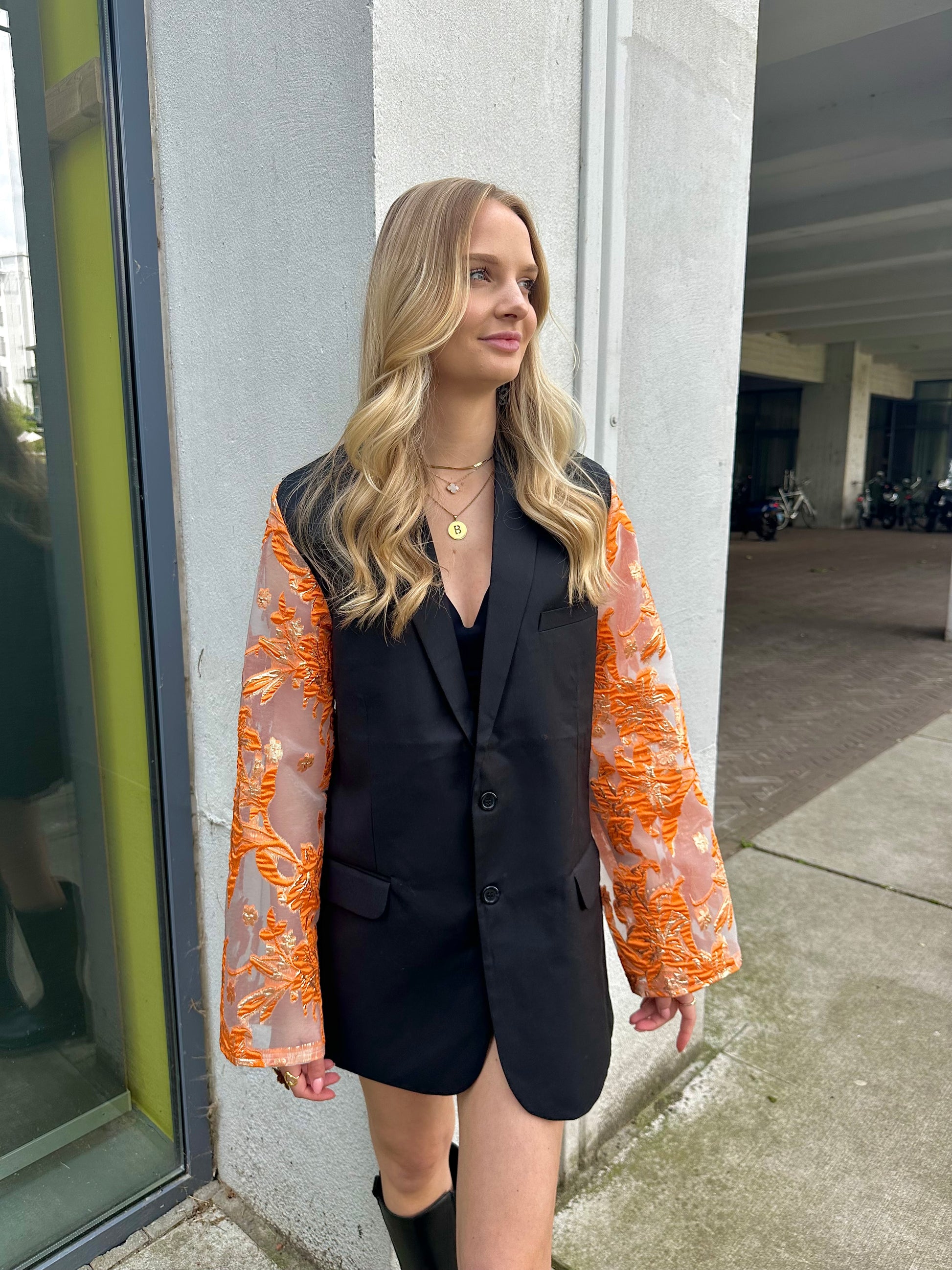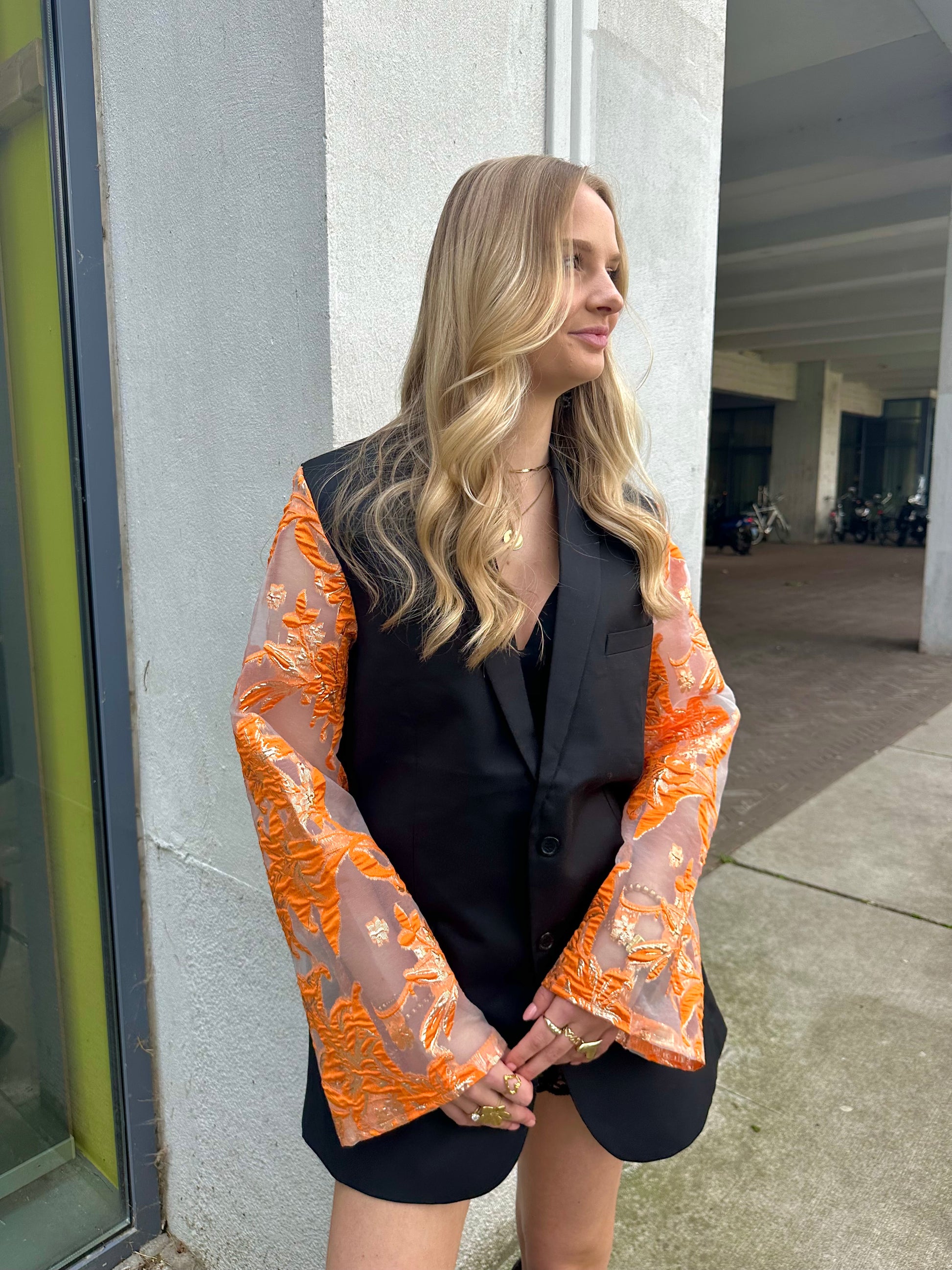 One size blazer met een oversized fit, passend van maat S t/m XL. De mouwen worden door mij met de hand gemaakt van een prachtige stof en in de blazer gezet. Hierdoor kan het patroon of de plaatsing iets afwijken van de foto, elk blazer is uniek.