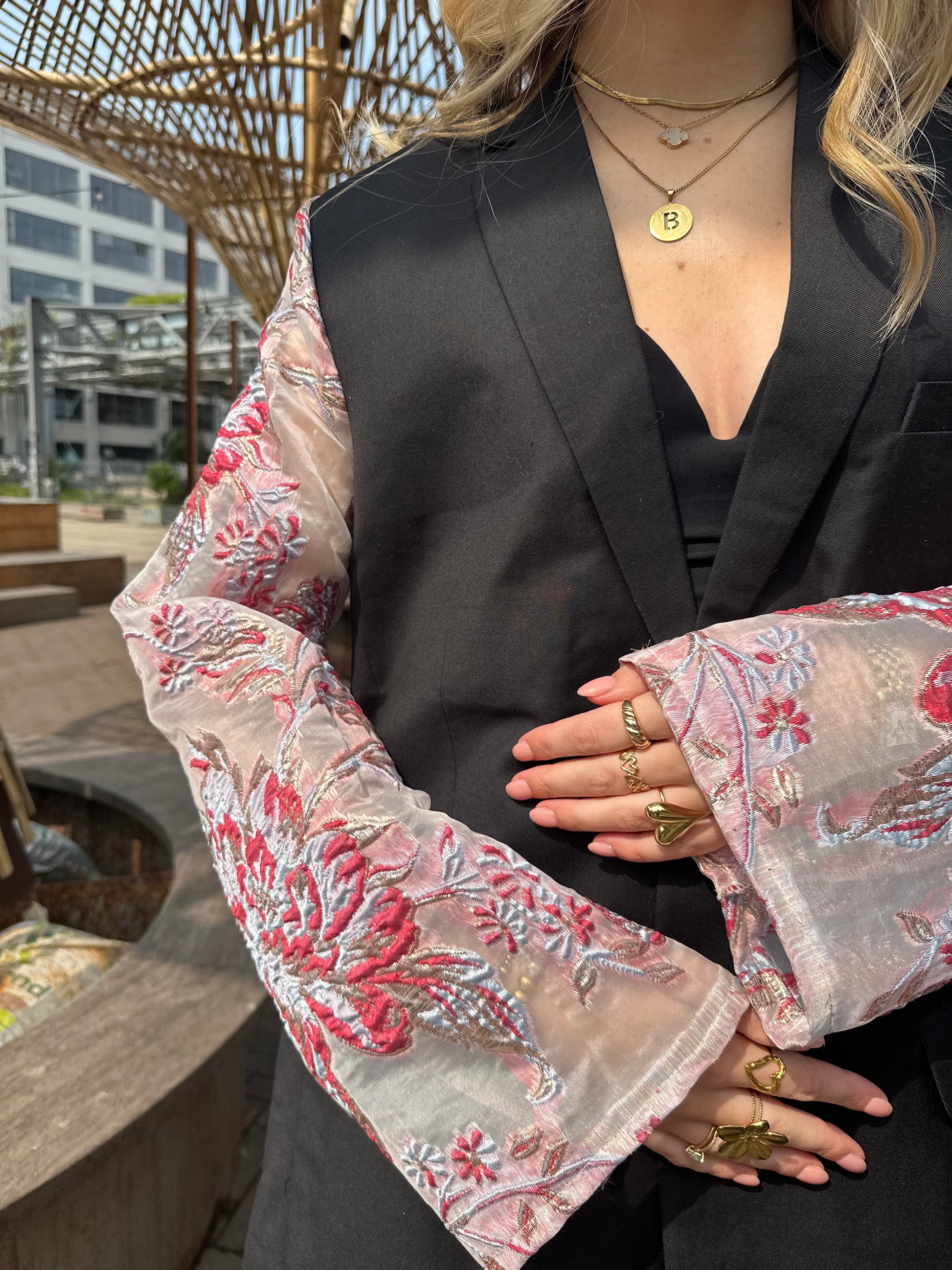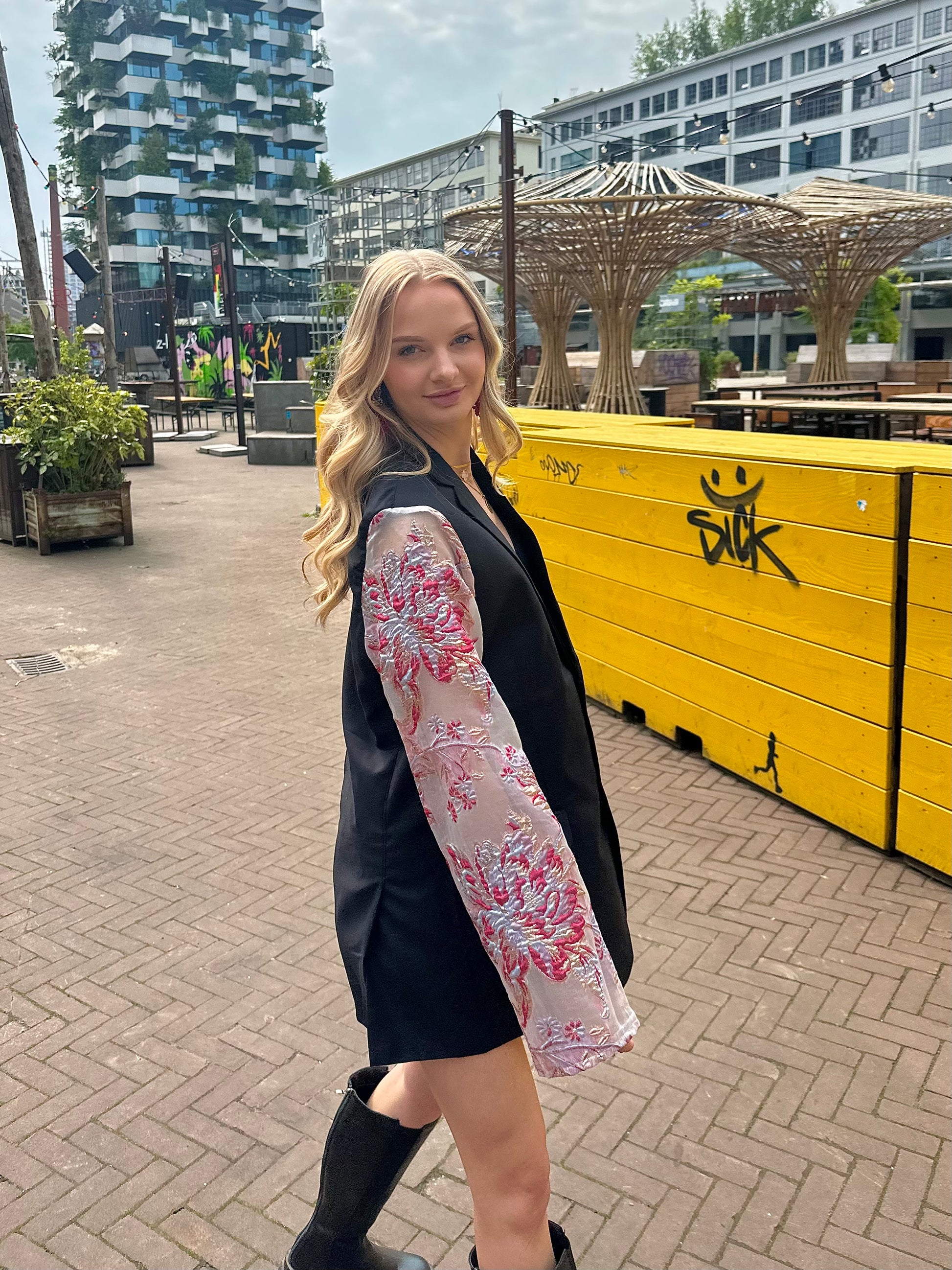 One size blazer met een oversized fit, passend van maat S t/m XL. De mouwen worden door mij met de hand gemaakt van een prachtige stof en in de blazer gezet. Hierdoor kan het patroon of de plaatsing iets afwijken van de foto, elk blazer is uniek.